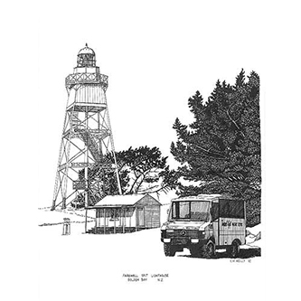 FAREWELL SPIT LIGHTHOUSE, GOLDEN BAY Pen & Ink Laser Print 297mm x 210mm |