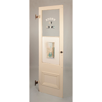 | THE DOOR UNHINGED Printmaking Installation on Antique Glass French Door |