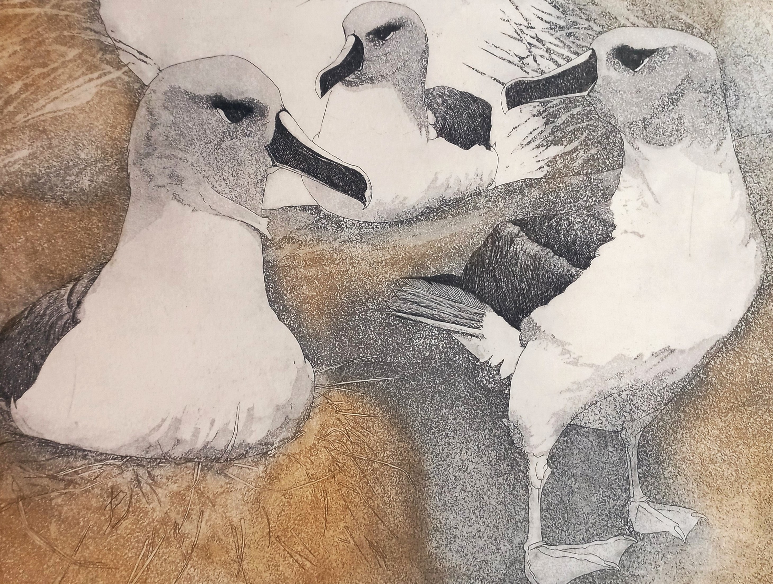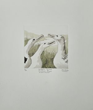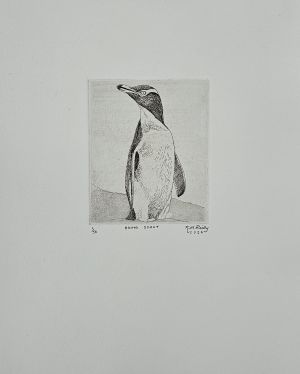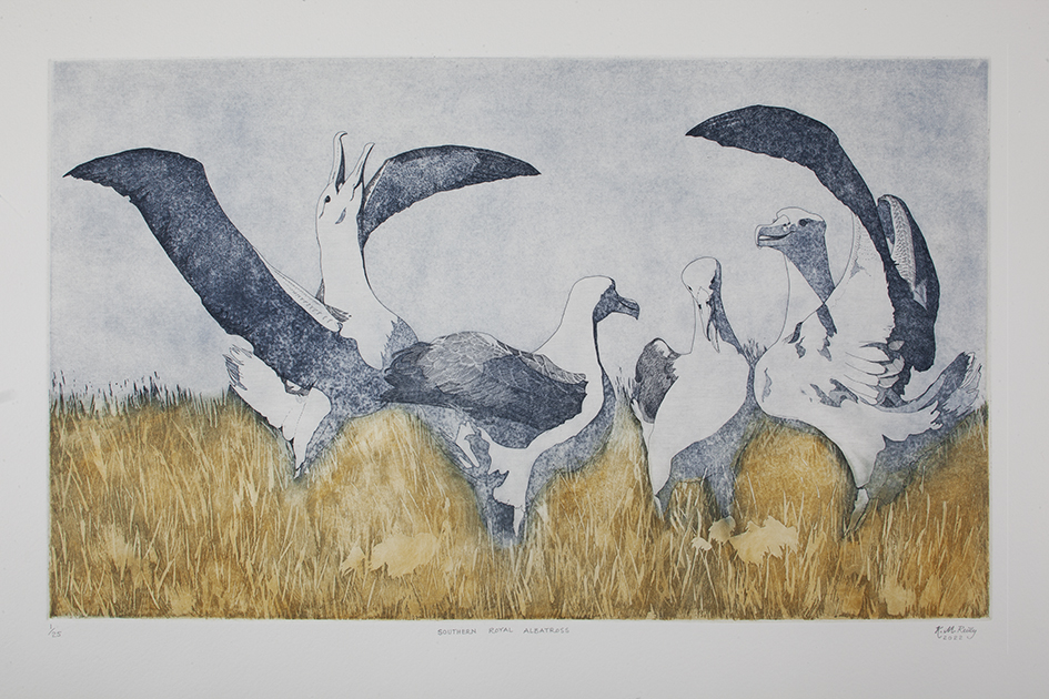 Landed Tucker Cove, Perseverance Harbour Saturday 4th December 2021. In cold grey skies, we climbed to Col Peak on continuous boardwalk, encountering Southern Royals at close range on several occasions. Making our own time, we stood in quiet wonder – filming, sketching, just observing for many minutes. The encounter with the Royal enroute to nest was eye to eye, both bird and human sizing each other up – no fear or flight from either party. The party of four Southern Royals were uninterested in bystanders, courting on their minds. From Col Peak we gazed West down to Northwest Bay, Complex Point and Dent Island. East down Northeast Harbour and Cossack Rock in the Southern Ocean |